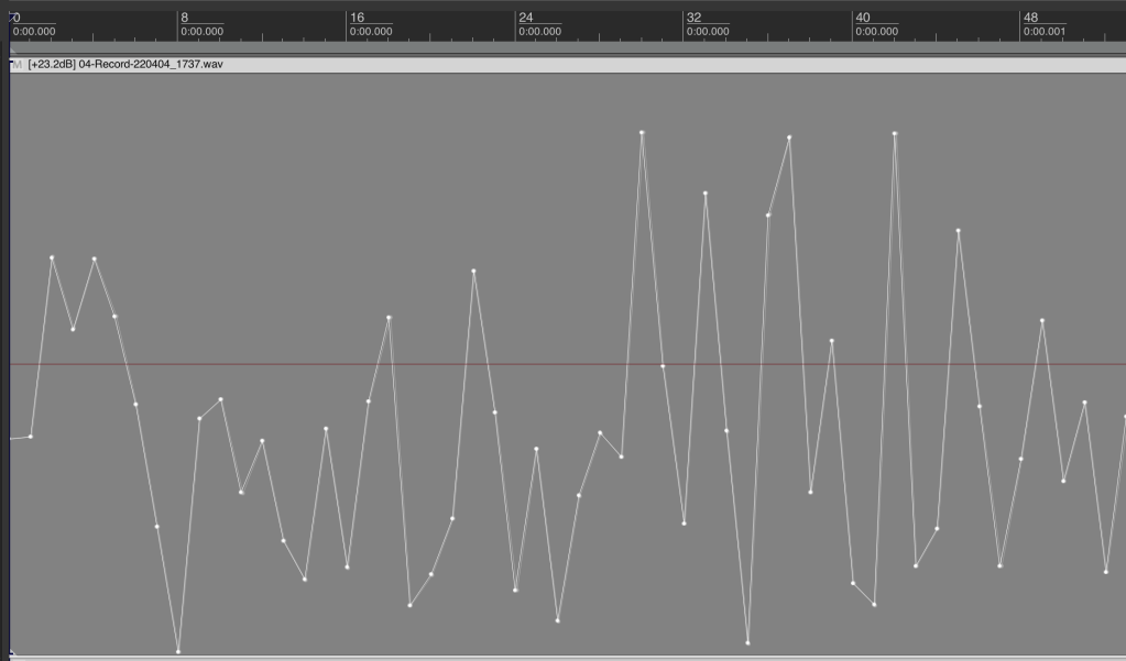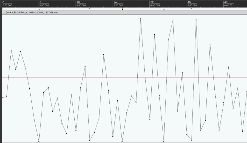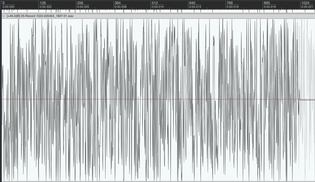 To find out I created a 48000(48kHz sampling rate of the device = 1s) sample long IR full of white noise and I’ll convolute a dirac impulse with it to see what kind of windowing is applied to the IR.