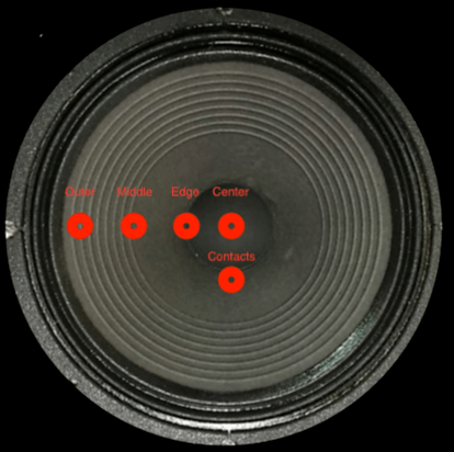 I have heard somewhere that micing the speaker where the wires are attached to the paper is better because it would sound less harsh. Well as far as I can tell that is not the case. The contacts position exhibits more high frequency content – expecially above 7kHz.